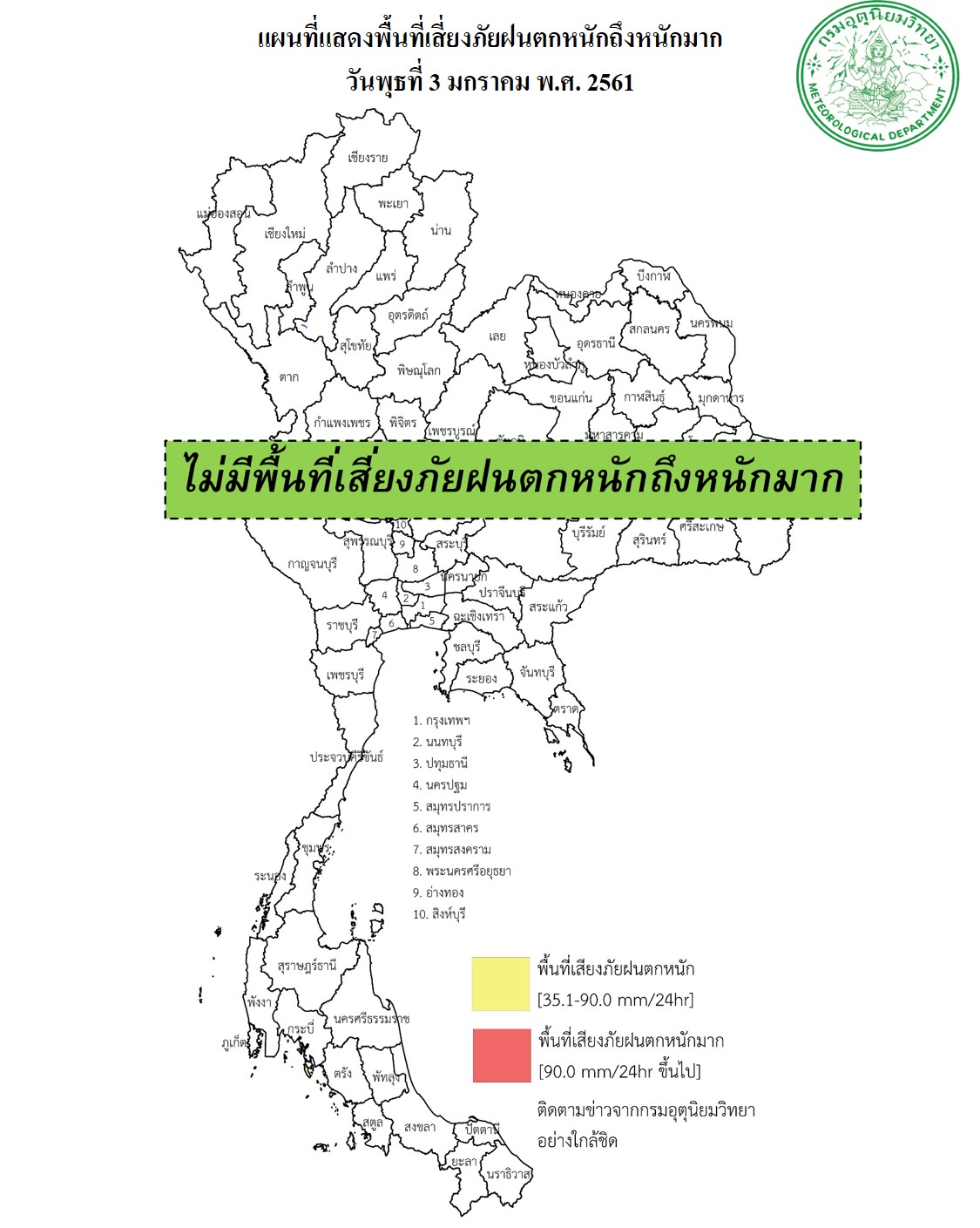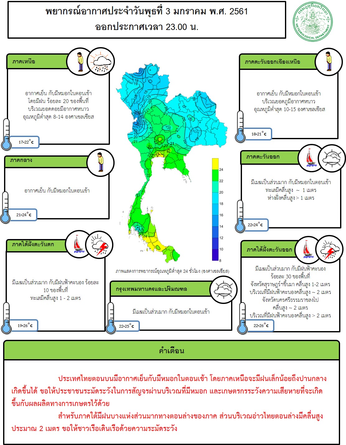 - ประเทศไทยตอนบนมีอากาศเย็นกับมีหมอกในตอนเช้า โดยภาคเหนือจะมีฝนเล็กน้อยถึงปานกลางเกิดขึ้นได้ ขอให้ประชาชนระมัดระวังในการสัญจรผ่านบริเวณที่มีหมอก สำหรับภาคใต้มีฝนบางแห่งส่วนมากทางตอนล่างของภาค ส่วนบริเวณอ่าวไทยตอนล่างมีคลื่นสูงประมาณ 2 เมตร ขอให้ชาวเรือเดินเรือด้วยความระมัดระวัง