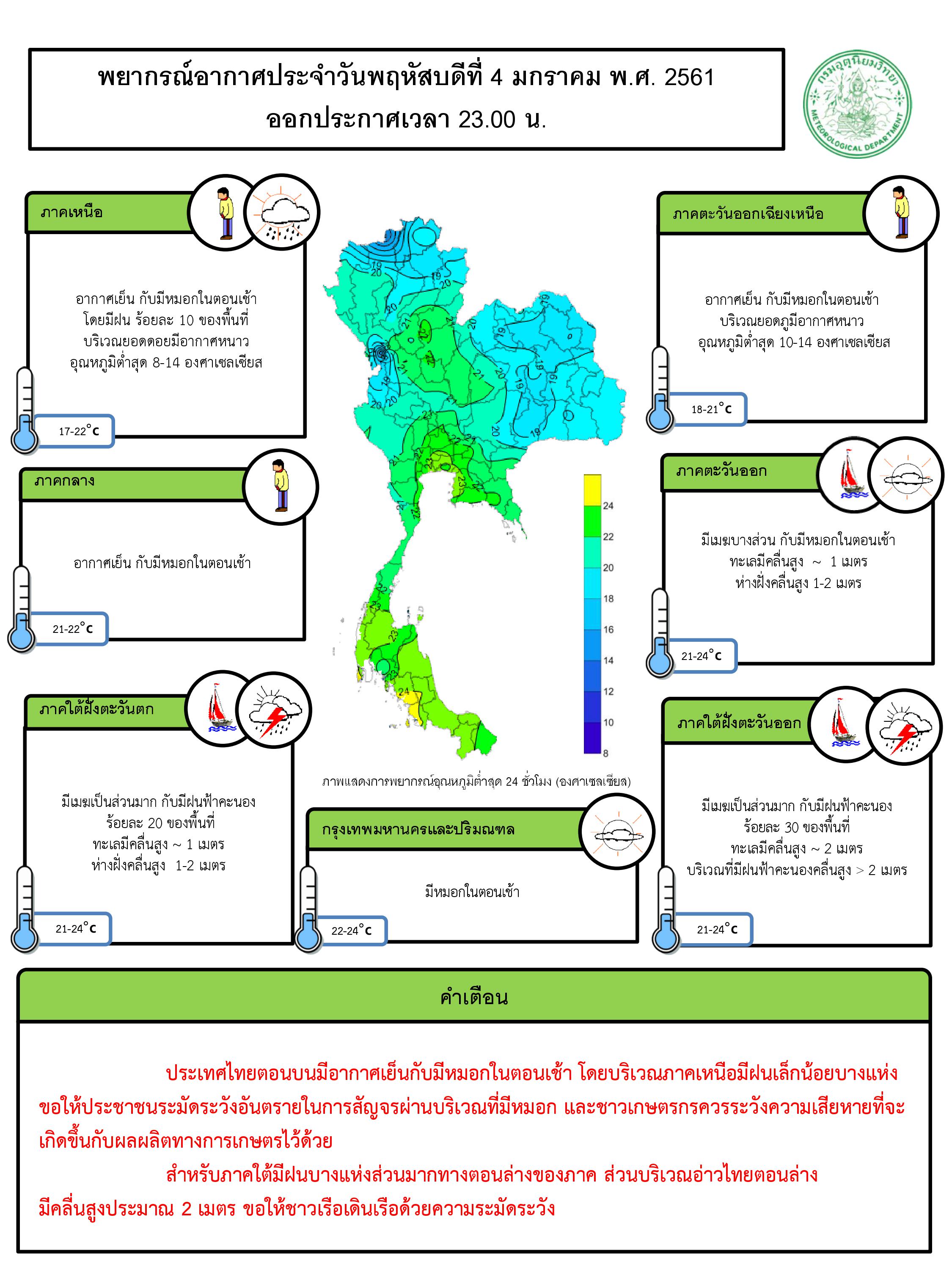 - ประเทศไทยตอนบนมีอากาศเย็นกับมีหมอกในตอนเช้า โดยบริเวณภาคเหนือจะมีฝนเล็กน้อยบางแห่งเกิดขึ้นได้ในระยะนี้ สำหรับภาคใต้มีฝนบางแห่งส่วนมากทางตอนล่างของภาค ส่วนบริเวณอ่าวไทยตอนล่างมีคลื่นสูงประมาณ 2 เมตร ขอให้ชาวเรือเดินเรือด้วยความระมัดระวัง กรุงเทพฯ และปริมณฑล มีหมอกในตอนเช้า โดยมีฝนเล็กน้อยบางแห่ง อุณหภูมิต่ำสุด 22-24 องศาเซลเซียส อุณหภูมิสูงสุด 31-33 องศาเซลเซียส ลมตะวันออก ความเร็ว 15-30 กม./ชม.