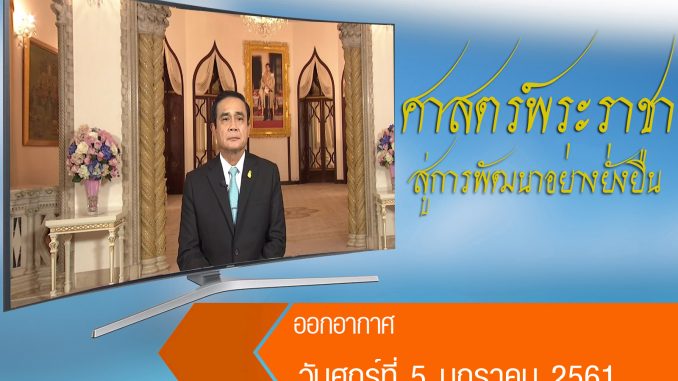 - นรม. และ หน.คสช. (พล.อ.ประยุทธ์ฯ) กล่าวในรายการศาสตร์พระราชา สู่การพัฒนาอย่างยั่งยืนเมื่อวันที่ 5 ม.ค. 61 ว่า เนื่องในวาระดิถีขึ้นปีใหม่ พุทธศักราช 2561 สมเด็จพระเจ้าอยู่หัวมหาวชิราลงกรณ บดินทรเทพยวรางกูร ทรงพระกรุณาโปรดเกล้าโปรดกระหม่อมพระราชทานพรปีใหม่แก่พสกนิกรชาวไทยทุกคน โดยทรงพระราชทานพรและความปรารถนาดี ให้ปวงชนชาวไทยมีกำลังกาย กำลังใจ และสติปัญญาที่แจ่มใส แข็งแรง มีความสุขความเจริญอันเป็นมงคลยิ่งๆ ขึ้นไป อีกทั้งทรงขอพระบารมีแห่งพระบาทสมเด็จพระปรมินทรมหาภูมิพลอดุลยเดช บรมนาถบพิตร และสิ่งศักดิ์สิทธิ์ทั้งปวง ให้ปกป้องคุ้มครองรักษาและให้คนไทยทุกคนมีขวัญกำลังใจในการที่จะเป็นพลังที่เข้มแข็งต่อประเทศและชาติบ้านเมืองสืบต่อไป ทั้งนี้ นรม. ได้กล่าวชื่นชมและขอบคุณพลเรือน ตำรวจ ทหาร อาสาสมัคร มูลนิธิ และจิตอาสาต่างๆ ที่ร่วมกันทำความดีเพื่อส่วนรวมในการอำนวยความสะดวกให้พี่น้องประชาชนเดินทางไป-กลับภูมิลำเนาโดยสวัสดิภาพ รวมทัั้งกล่าวชื่นชมกิจกรรม “สวดมนต์ข้ามปี” ที่จัดต่อเนื่องมาทุกปี โดยในปีนี้มีสาธุชนเข้าร่วมกิจกรรมมากถึง 20 ล้านคน จากทุกศาสนา หรือประมาณ 1 ใน 3 ของประชากรทั้งประเทศ